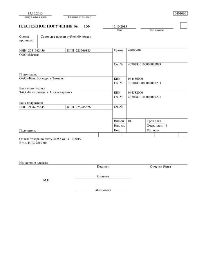 Образец заполнения платежки