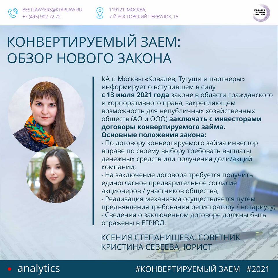 Конвертируемый займ представляет собой гибкий инструмент финансирования, который требует тщательной юридической проработки. Правильно структурированная сделка позволяет совместить интересы инвесторов и основателей компании, минимизируя риски всех сторон.